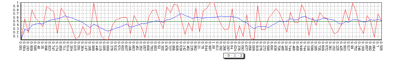 得到的有三条线,一条是随机数线,一条是整体的平均值,是一条直线,另外一条蓝色线则是一个移动平均后的平滑线。