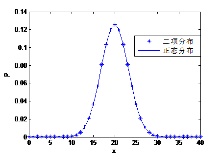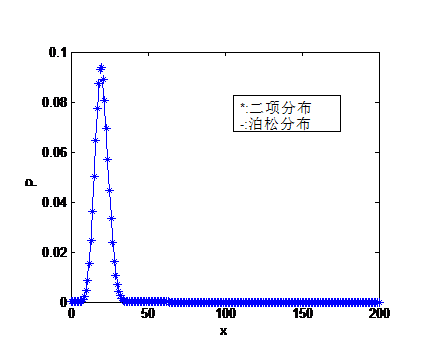 图5-9 B(40,0.5)与N(20,10)的近似情况图5-10 B(200,0.1)与poisson(20)的近似情况