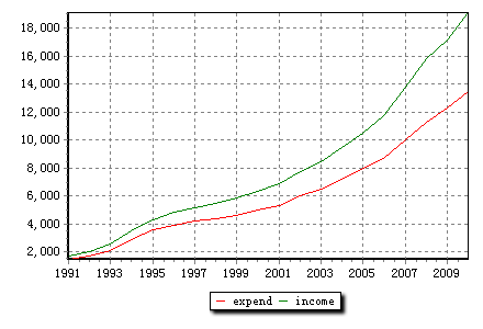 图7-1:1991-2010年城镇居民可支配收入与消费性支出间变化
