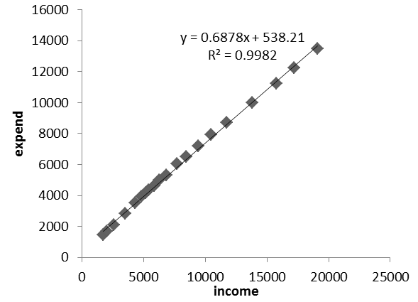 在这里,我们没有涉及指标的取舍,主要考察城镇居民消费性支出与可支配收入之间的关系。根据凯恩斯的说法,我们可以指出两者之间明确的函数关系(消费函数)
