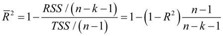将残差平方和与总离差平方和之比的分子分母分别使用他们各自的自由度去除,变成均方差之比,以消除解释变量个数对可决系数的影响,修正的样本决定系数为: