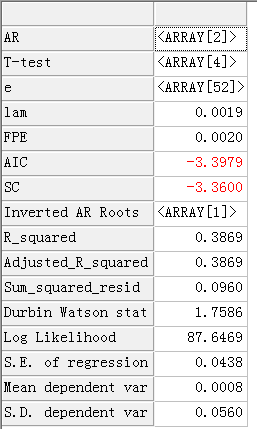 我们可以初步将模型定为ARMA(1,0)。使用AIC准则,可以知道模型在ARMA(1,0)时,AIC统计量最小,所以我们给数据DLGDP拟合ARMA(1,0)模型。