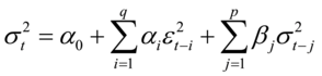 GARCH 模型:ARCH(p)模型解决了时间序列中的异方差问题,但在实际应用中常出现的条件方差依赖于很多期之前的变化量,因此必须估计很多个参数;另外,对大多数的q,无限定约束的估计常常会违背非负的限定条件。为此,Bollerslev(1986)扩展了Engle的原始模型,提出了广义的自回归条件异方差GARCH模型,在方差方程中用一个或两个的滞后项代替很多个的滞后值。一个高阶的ARCH模型可以由一个更为简洁、更易识别估算的低阶GARCH 模型来表达。GARCH(p,q)模型的方差方程的一般形式如下: