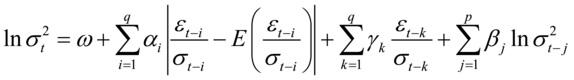 指数GARCH模型或EGARCH模型是由Nelson(1991)提出的,采取条件方差对数的形式,方差方程形式如下:
