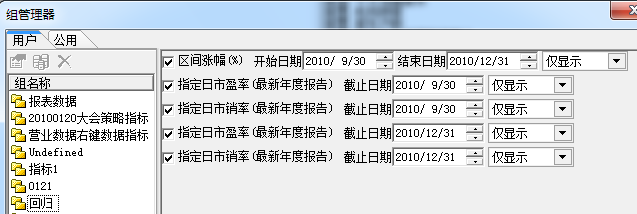 将选中的指标保存为指标组,方便下次调用。在弹出的“组管理器”窗口中,可设置指标组的名称。