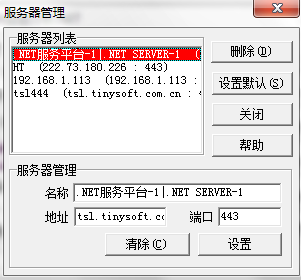 按钮;在弹出的“服务器管理”窗口中,双击你登陆的服务器名,如此处双击“.NET服务平台-1|.NET SERVER-1”,下方显示地址:tsl.tinysoft.com.cn,端口:443,此表名链接的是天软的服务器。