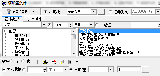 :使用选股向导获取股票列表,譬如选取深证A股中,当前最近一个报告期的每股收益大于1的股票,如下图所示。