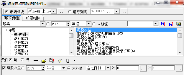 :设置动态板块,可将一个或多个条件作为动态选股条件,譬如在所有A股中选择最近1个报告期的每股收益在0到1之间的股票,如下图所示。