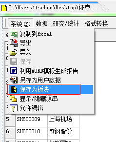 除了通过板块管理外,当手动打开一个外部文件,或者通过程序跑出一个结果后,单击数据窗口上的“系统”->“保存为板块”,如下图所示。