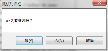 弹出如下消息对话框,选择“是”则返回“是”按钮id的返回字,选择“否”则返回“否”按钮id的返回字,选择“取消”则返回“取消”按钮id的返回字。