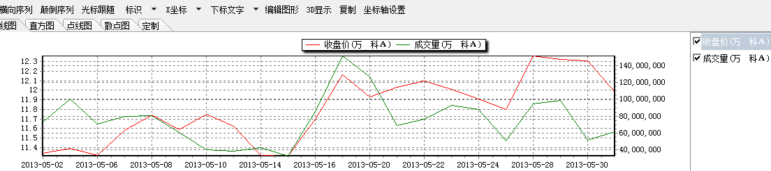 比如,显示万科A一段时间的收盘和成交量数据:要求左轴标示收盘价,右轴标示成交量。