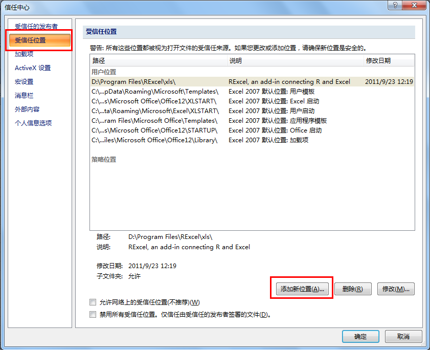 进入到Excel选项-》信任中心-》信任中心设置-》受信任位置-》添加新位置;