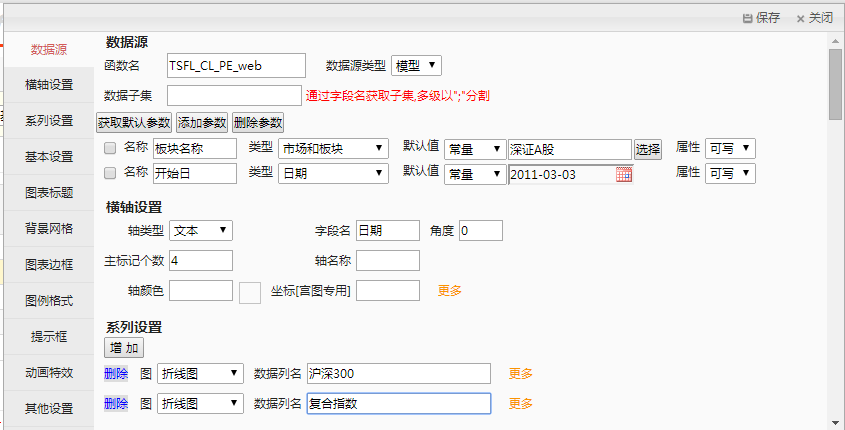 添加网页内容:折线图。点击编辑按钮,加入我们自己的策略模型“策略验证-P/E”。其中“X轴设置”与“Y轴设置”为必填项,其“字段名”和“数据列名”对应模型返回结果表字段。