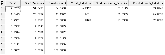 ret["Total Variance Explained",0]:第一列为样本矩阵的相关系数矩阵的特征值,第二列为方差贡献率,第三列为累计方差贡献率