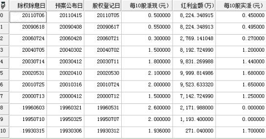 返回指定股票上市以来截止当前时间(除权除息日)的分红情况,该函数和证券代码、当前时间有关。