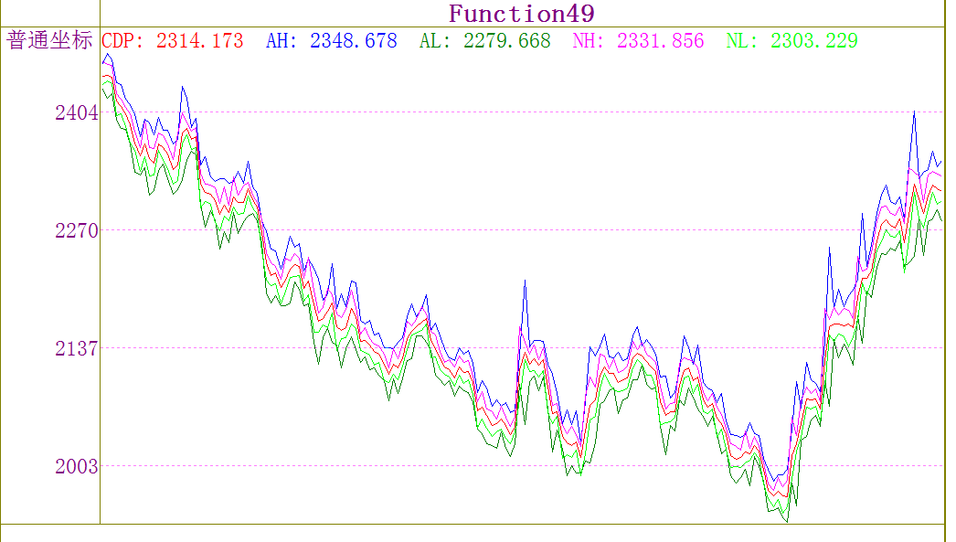 逆势操作;超级短线指标;CDP 为最高价、最低价、收盘价的均值,称中价;中价与前一天的振幅的和、差分别记为AH(最高值)、AL(最低值);两倍中价与最低价的差称NH(近高值),与最高价的差称NL(近低值)。