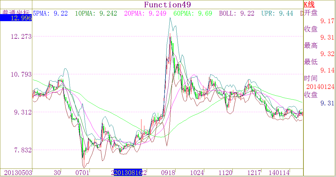 带BOLL的K线;带BOLL的K线:图形叠加的方法2。直接使用函数参数,调用MergeGraph进行图形叠加;