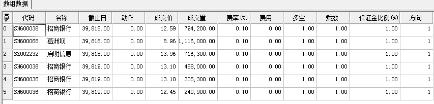 ("代码":"SH600036","名称":"招商银行","截止日":39819.00,"动作":0.00,"成交价":13.1,"成交量":305300.00,"费率(%)":0.1,"费用":0.00,"多空":1.00,"乘数":1.00,"保证金比例(%)":1.00),