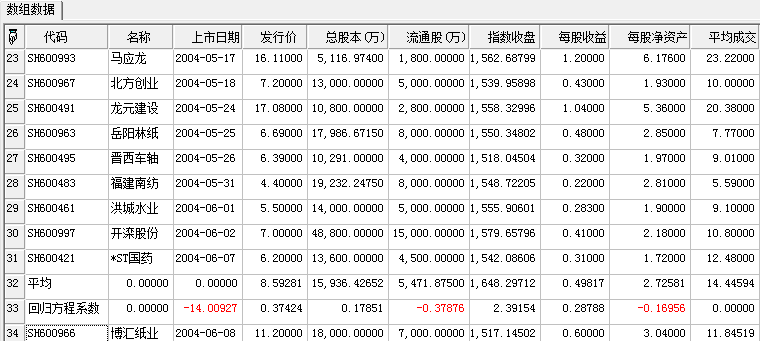 | 返回 | TableArray | 股票的上市期一些财务数据,以及次股的上市期财务数据与上市期的开盘价回归信息 |