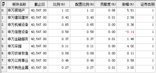 ("代码":"SZ000001","名称":"平安银行","板块名称":"申万金融服务","截止日":40547.00,"市值(万)":4903379.17867895,"涨幅(%)":1.45662125691135,"比例(%)":0.368360845434954,"贡献度(%)":0.00536562237674391,"配置比例(%)":0.368360845434954),