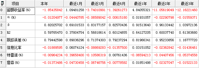 组合-相对回报,展示多个周期的超额收益率、alpha、beta、跟踪误差、信息比、特雷诺、詹森。