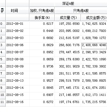QueryBKWithPeriod("深证A股","",@True,"","换手率(%)(加权,只考虑A股)",@Bk_HSL3(0,1),