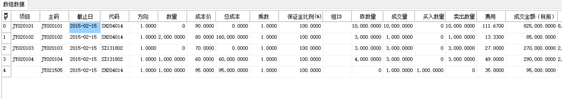 ("主码":"JY021505","截止日":42050.0,"代码":"SH204014","方向":1.0,"动作":0.0,"成交价":95.0,"成交量":1000.0,"成交金额(税前)":95000.0,"费用":35.0,"成交金额2":95000.0,"序号":5.0,"乘数":1.0,"保证金比例(%)":100.0,"利息":950.0,"组ID":"")