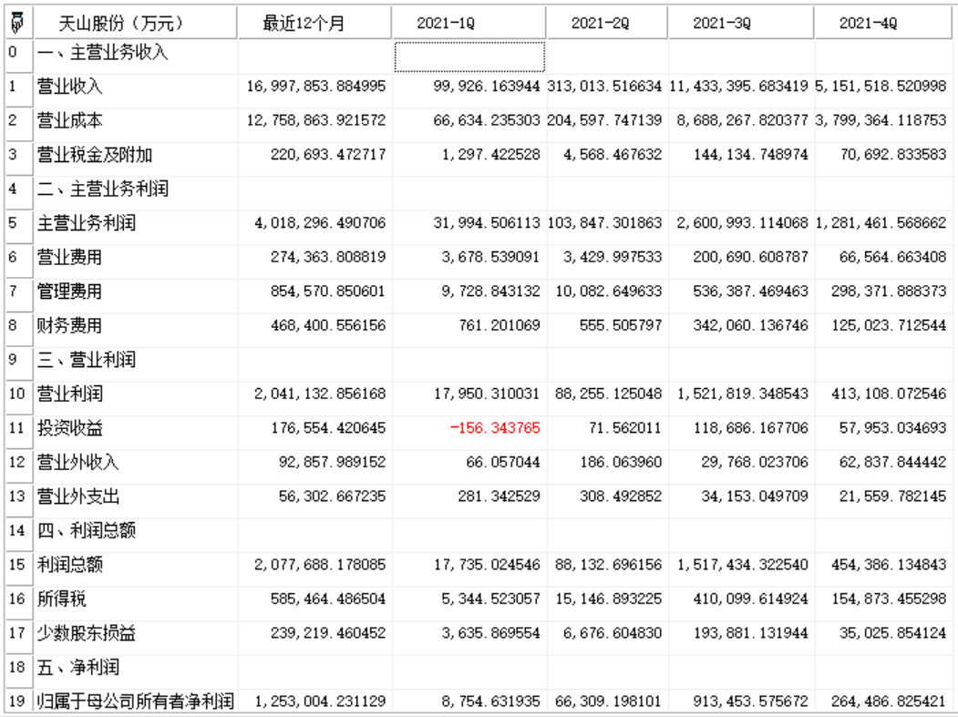 //返回天山股份按照季度显示的最近4个报告期的利润分配表数据
