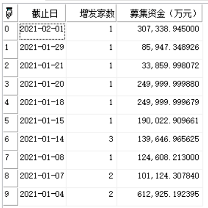 | 返回 | Array | 数组类型,返回指定板块指定区间增发纵比数据 |