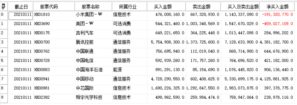 //返回港股通(沪)在指定日20210110-20210111区间的十大活跃股