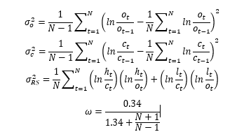 计算YZ波动率因子,使用最高价、最低价、开盘价、收盘价计算出的波动率(%),与系统证券、时间、周期相关