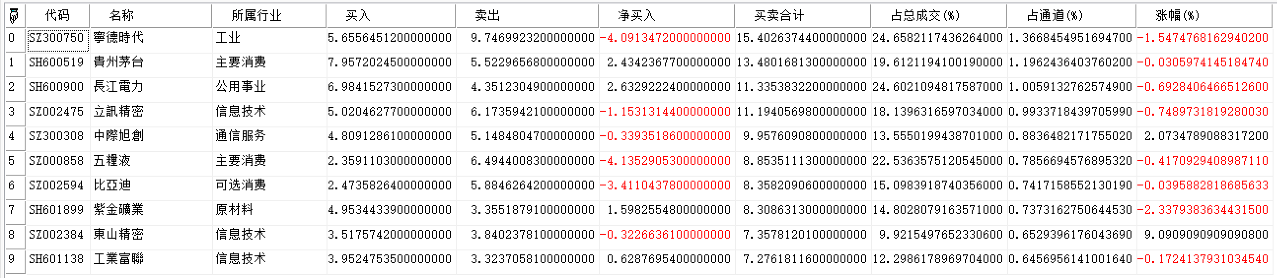 | 返回 | Array | 数组,指定日陆股通最新10大成交。 |