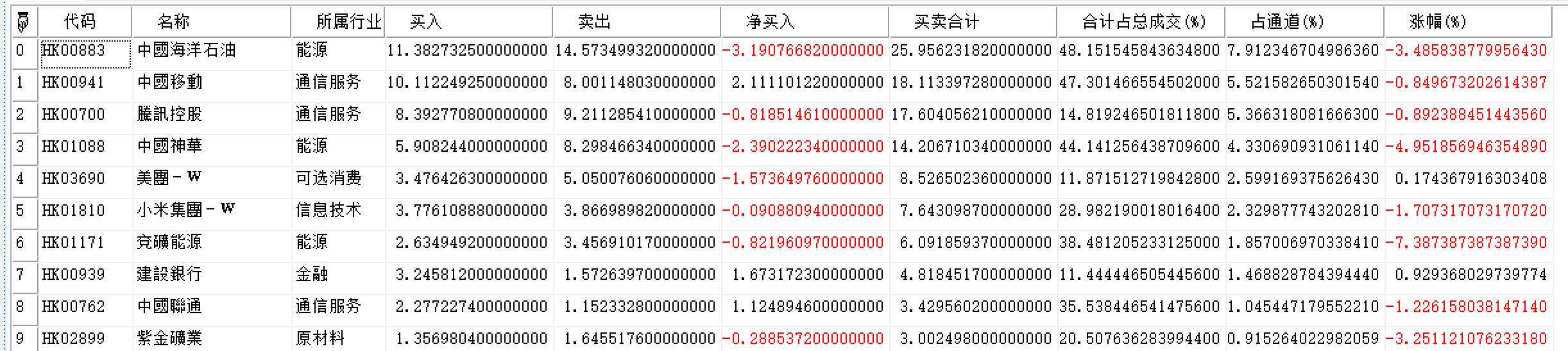 //返回截止至2024-07-10日港股通板块中证一级行业最新10大成交