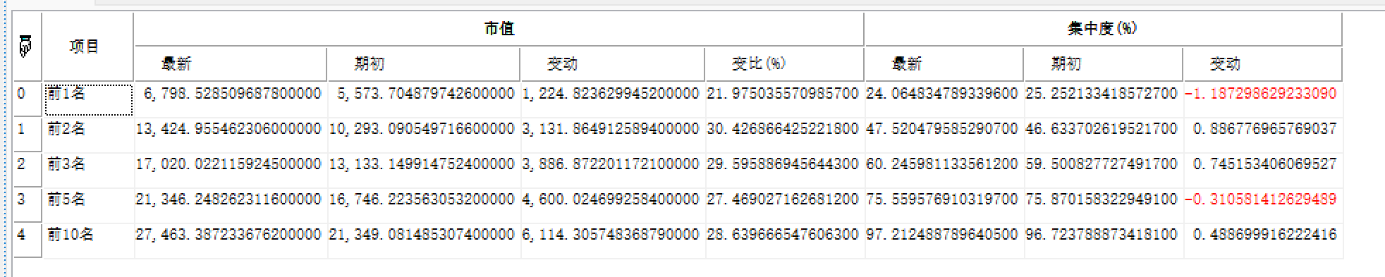 | 返回 | Array | 二维数组,港股通的行业集中度及与上期环比变化。 |