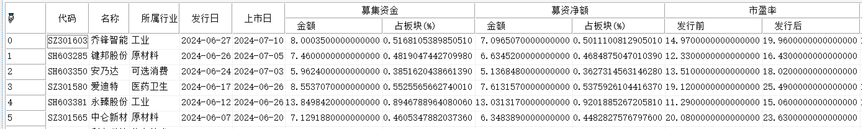 //返回2023-07-10至2024-07-10日A股中证一级行业中所有股票的发行上市明细