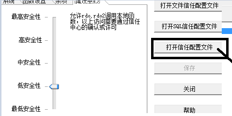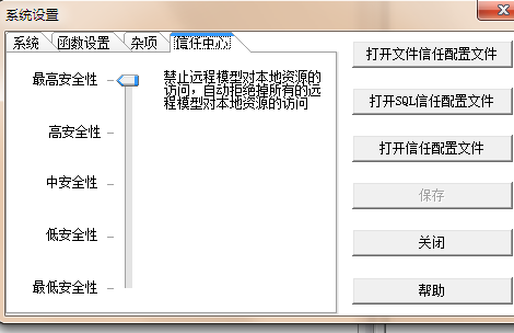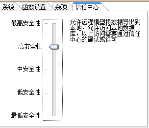 信任中心的初始是最高安全性,禁止了远程模型对本地资源的访问。如果我们只需要导出数据到本地或者执行本地的数据库查询语句,那么我们可以选择高安全性,高安全性允许RDO/RDO2执行的函数是ExportFile和ExecSQL。