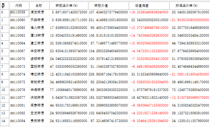 其中回归数据中标准溢价率(%)为转债当前转股价值根据回归系数计算出的溢价率(%),估值偏差即为回归残差。回归权重即为回归的系数。回归结果为回归的整体结果,包括回归系数、残差、回归检验等,返回同Regression。典型溢价率即为当日按照所给Tvalues中的转股价值通过回归计算出的溢价率。