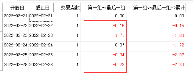 (2)第一天的因子为零,即“第一组vs最后一组”为0,无实际含义,为多因子框架结构所致,因此若要计算2022-02-22~2022-02-28区间的因子,开始日需要往前推一个交易日,即开始日需设为2022-02-21,即真正有用的因子收益率数据从第二行开始。